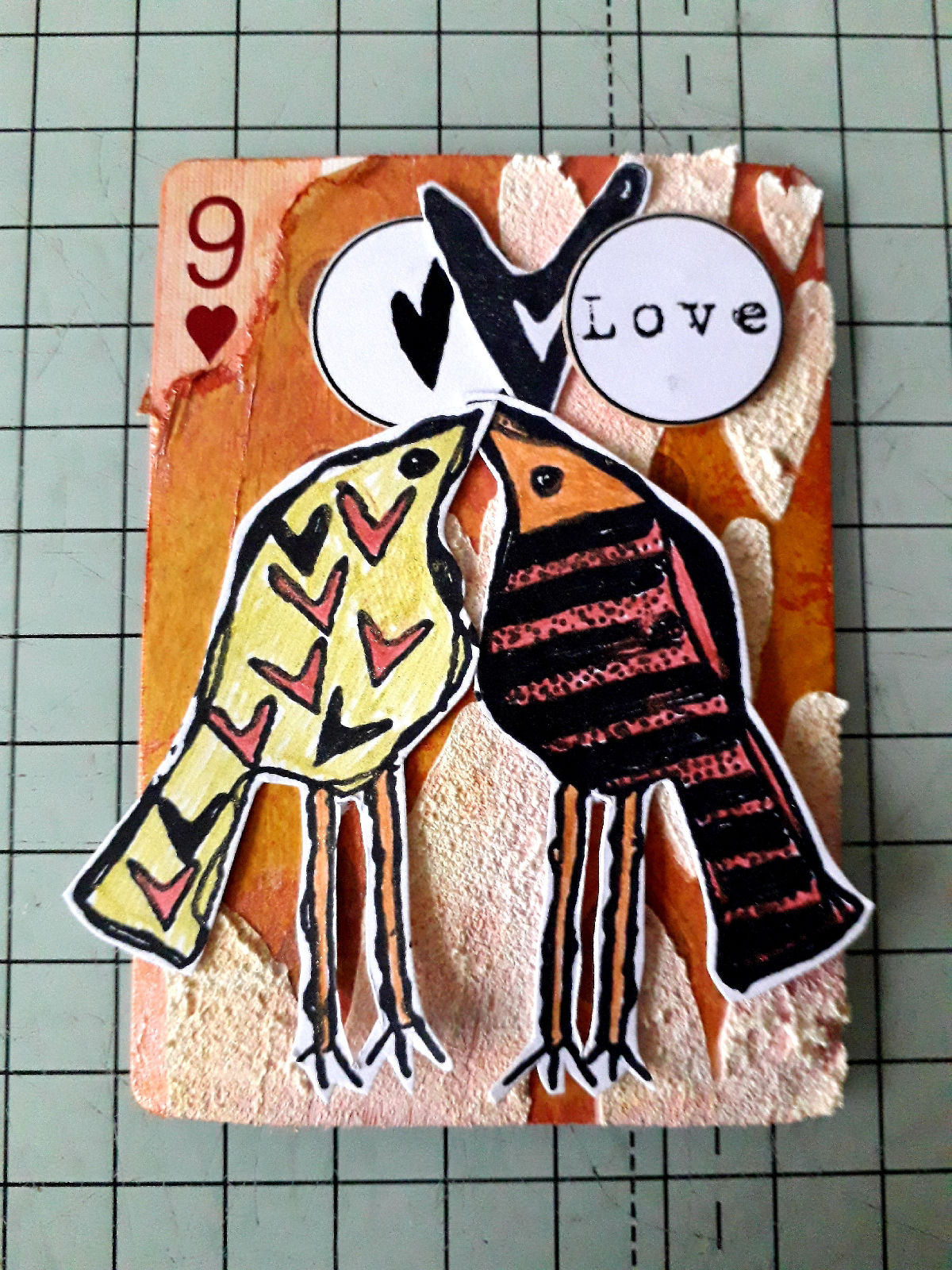 To finish the card I coloured the flowers and the space between the two borders. Then blended a small border of red ink around the edge of the card before gluing it to a six inch square card blank.